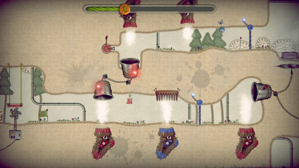 We will begin with the graphics as that is what stands out the most to me. In this day and age, I get that developers want to craft something out of the blue: something that will make their creation be the talk of town, distinct from the esthetic skews of other marketplace variants. But there has to be a consistency; things have to make sense, even in the context of a fictional setting, and that just wasn’t the case here. I noted the similarities to Kirby’s Epic Yarn earlier, but what I didn’t mention was how Respect Studios thought it a good idea to combine this with a half-baked steampunk schema. Imagine cross-stitch patterns filled with pipes, gears, chains, screws, sawblades, and smoke-filled rods and you’ll have an idea of what Where’s Samantha? looks like. Even the storybook at the very beginning, which contains beautiful pictorial drawings, is adorned with metal casings whilst atop a table cloth.