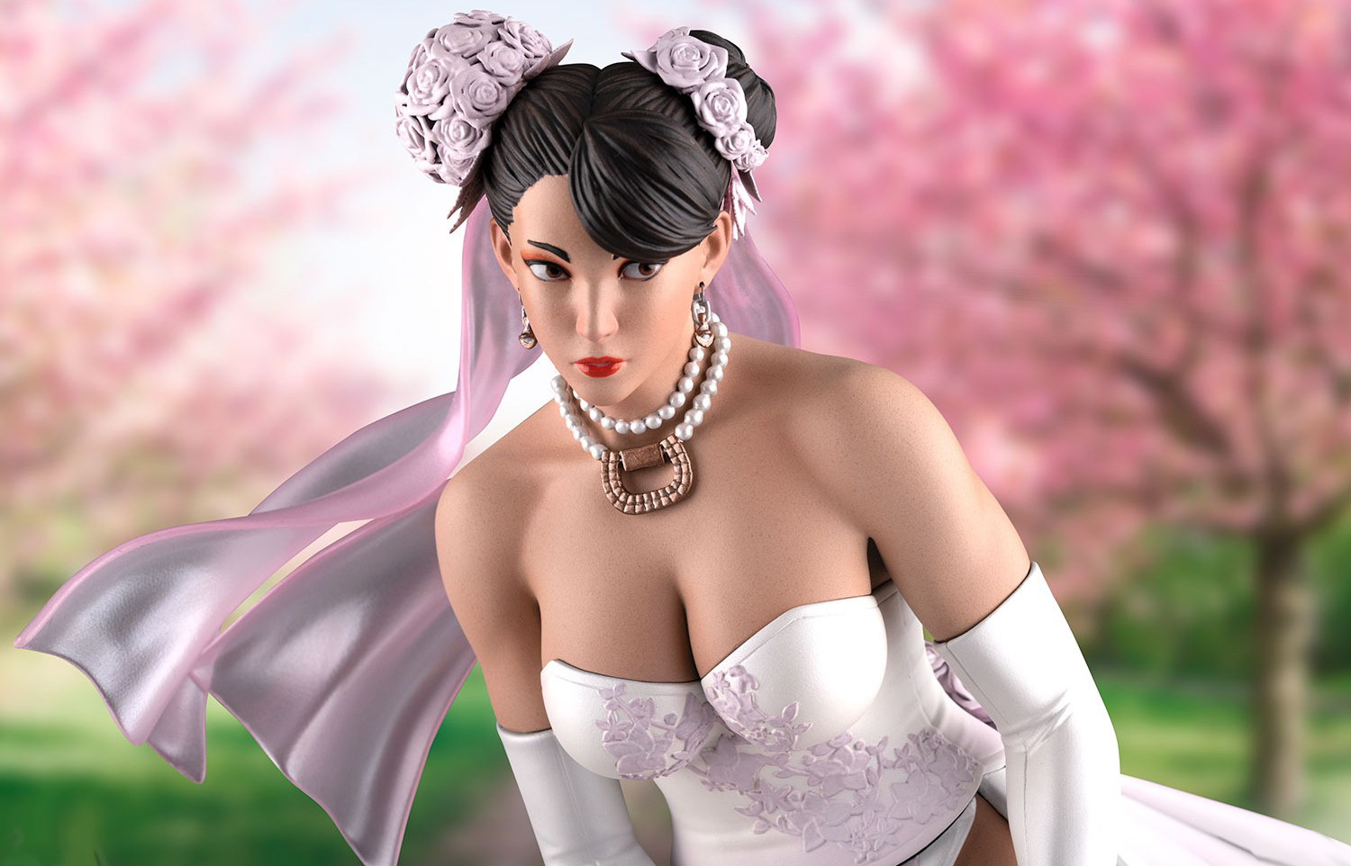 Here comes the bride — ready for battle! The Wedding Dress Chun-Li Statue measures 15.5” tall and 9” wide as the iconic Street Fighter heroine stands on a wood-like floor dotted with pink flower petals. The gorgeous white wedding gown emphasizes her gracefulness and athletic physique as Chun-Li slips the garter from her leg ahead of a fight.