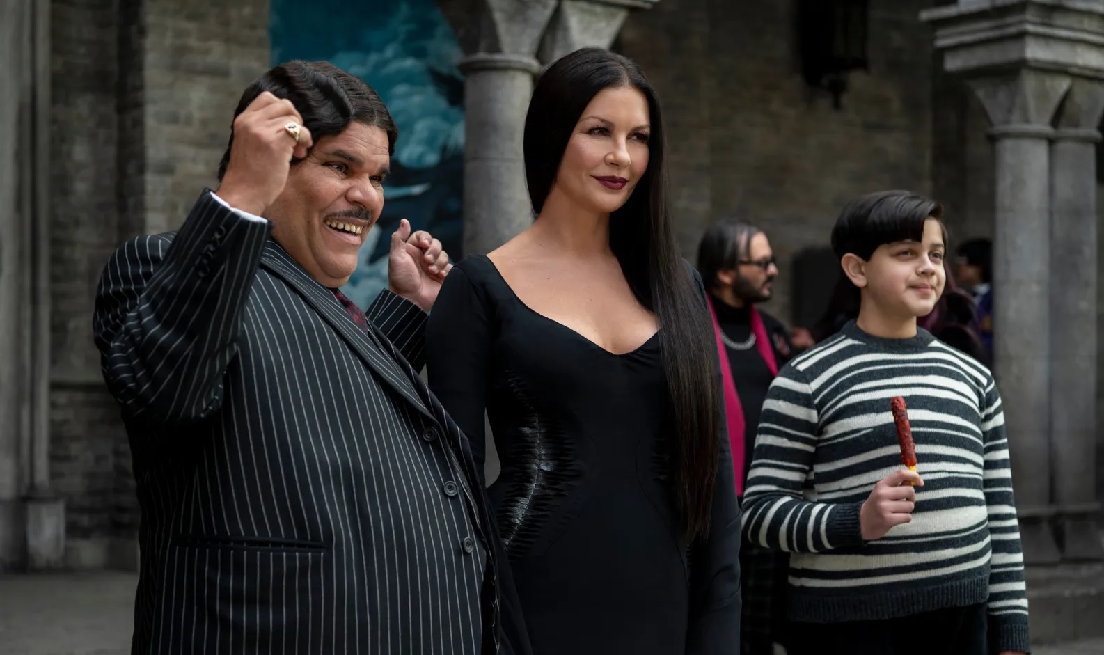 Wednesday stars Jenna Ortega as Wednesday, Catherine Zeta-Jones as Morticia, Luis Guzmán as Gomez, Isaac Ordonez as Pugsley, and Fred Armisen as Uncle Fester alongside a cast that also includes Gwendoline Christie, Hunter Doohan, Percy Hynes White, Joy Sunday, Emma Myers, Riki Lindhome, Jamie McShane, Georgie Farmer, Naomi Ogawa, and Moosa Mostafa.