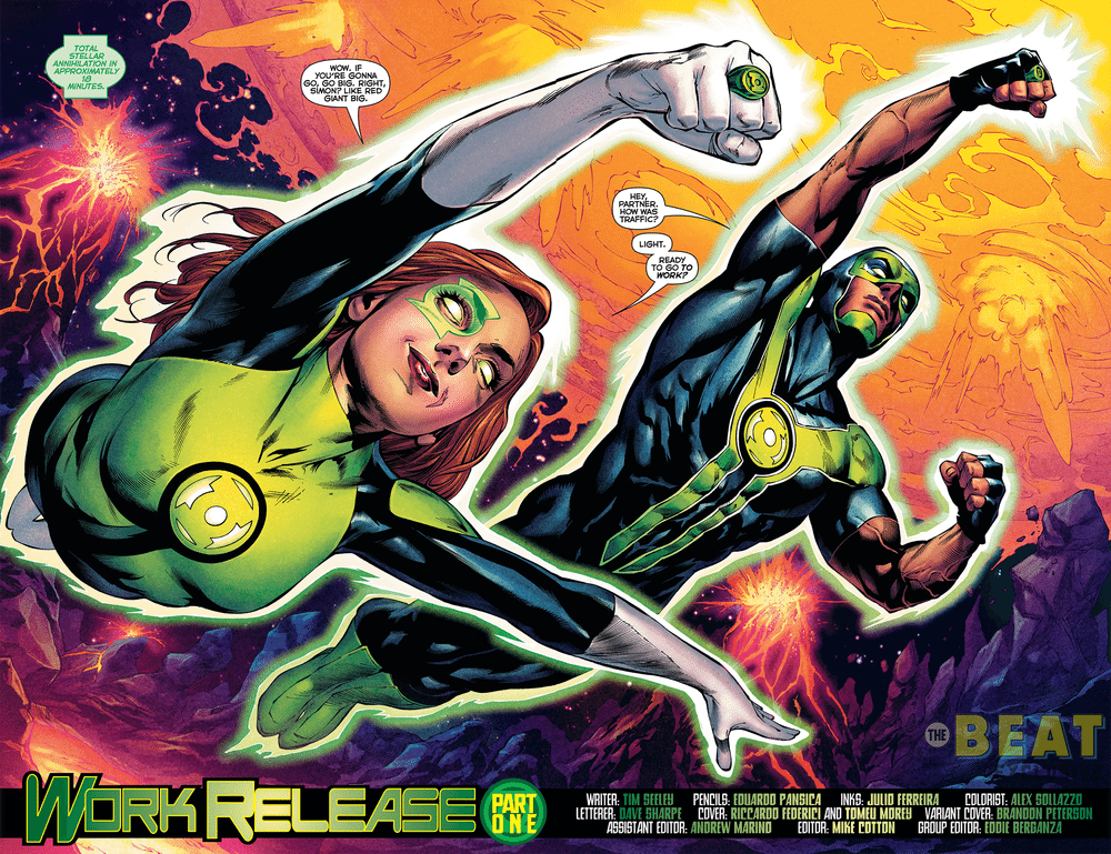 “WORK RELEASE”! Being a member of an intergalactic police force and the Justice League isn’t easy, but Simon Baz and Jessica Cruz face their most dire threats when they return to Earth and are forced to…get jobs?!