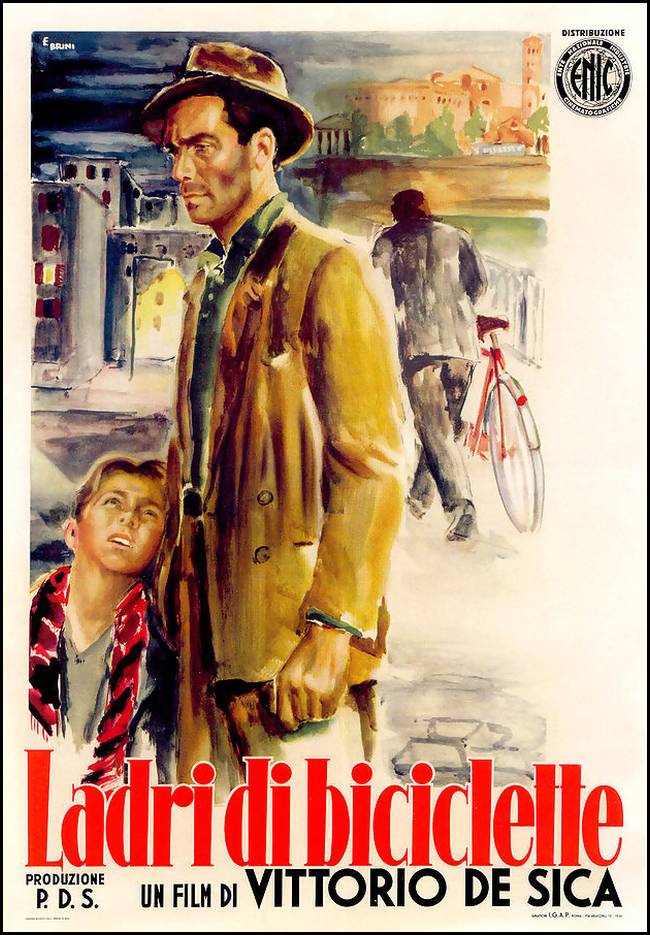 One of the best known of the neo-realist films would be Vittorio De Sica’s Ladri di biciclette (Bicycle Thieves, 1948) about a working class man who having been unemployed for a long time accepts a job as a bill sticker. In order to do this job he must be in possession of a bicycle. Having pawned his bed sheets in exchange for his bicycle, he sets out on his new job only to have it stolen. He then sets off on a fruitless quest with his young son to find it. Driven to the point of desperation he tries to steal one himself only to be captured and then released by the sympathetic owner.
