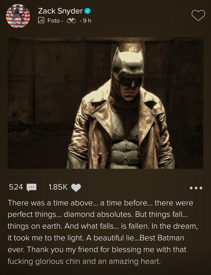 Posting on his Vero account, Snyder has now paid tribute to Affleck’s portrayal, hailing him as the “best Batman ever” and thanking him for “blessing me with that fucking glorious chin.”